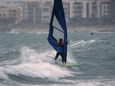 Vendredi, St Cyprien. Petit marin annoncé, à notre arrivée c'est light 12-14 noeuds, çà monte un peu, Christophe nous téléphone d'Argeles c'est bon pour 4.7 (merci), mais j'ai déjà gréé 5.7 je reste, et je sais qu'avec un peu de patience le vent va arriver à St Cyp. En effet au bout de 3/4 d'heure je grée 4.7, un peu juste de temps en temps, pas mal de clapot, mais un soleil de fou et la douceur. Une belle petite session.